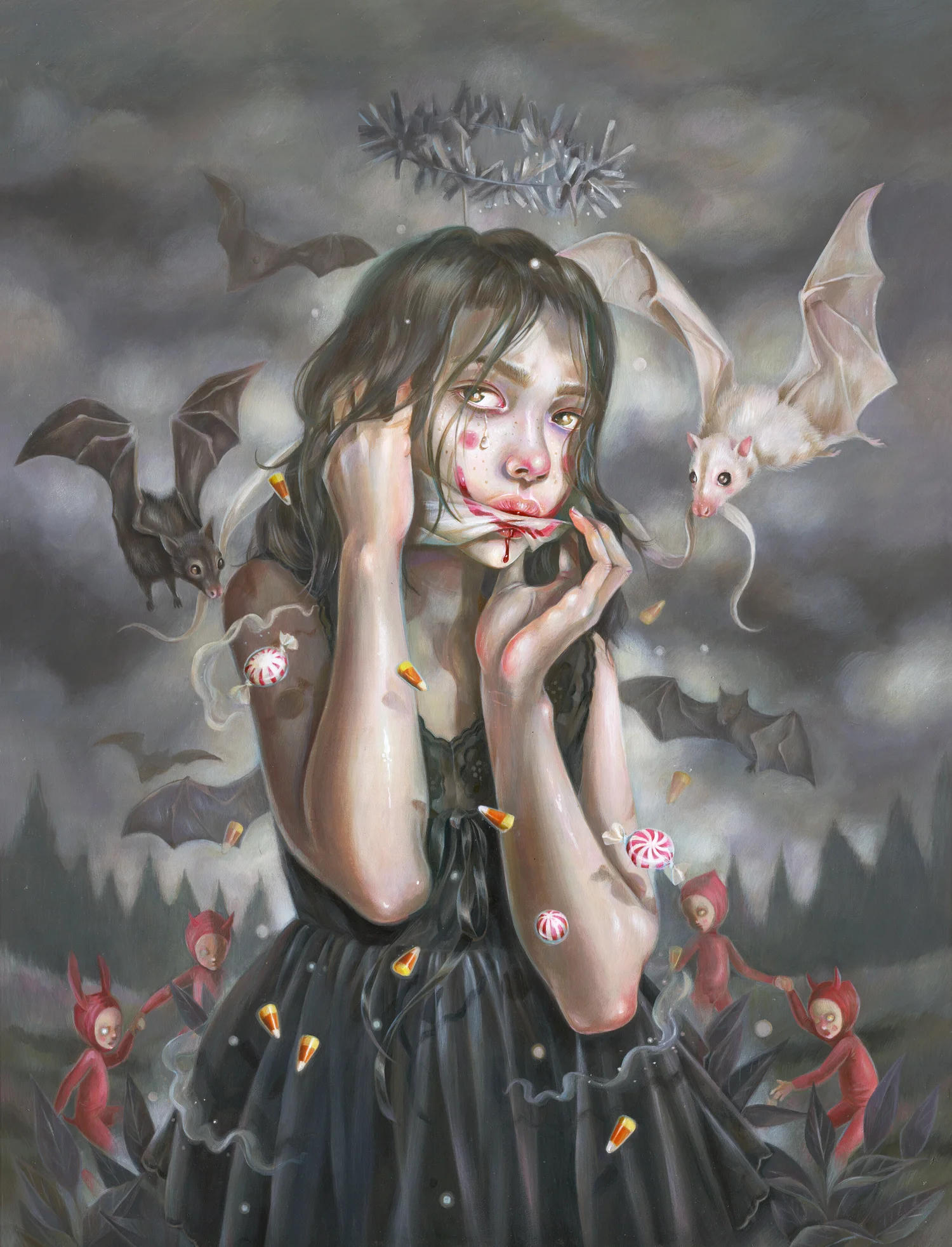 Her compositions talk about isolation, vulnerability, and the yearning to belong. In her word, childhood is macabre. The kids are terrified, apathetic, or surprised. Eyes red from crying, mysterious wounds, and blood dripping. They seem trapped in neverending nightmares, scenes of innocent playtime mixed with ghosts, demons, and rats.